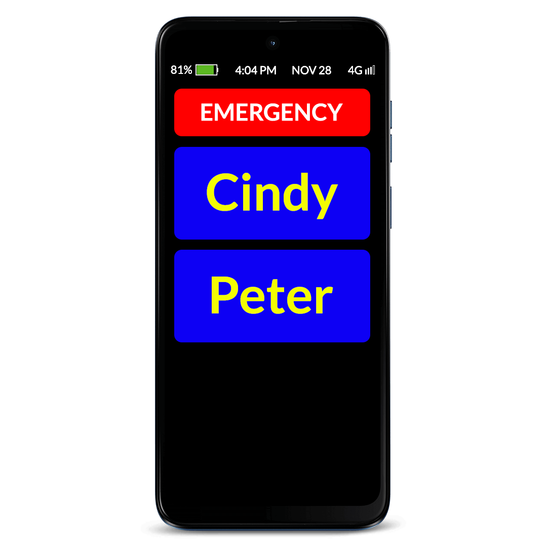 There is no menu system! The phone has a single screen that displays contacts as pictures with their names underneath. That’s it. The senior cannot access any apps, settings, or other features. Simplicity is the priority.
