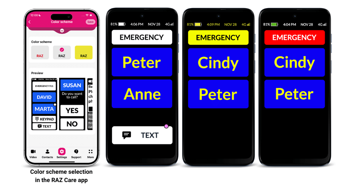 Loved ones can easily manage all aspects of the RAZ Memory Cell Phone remotely through the RAZ Care app. For example, the app allows caregivers to add and edit contacts, check the phone’s location, control who can call the senior and who the senior can call, video call the senior, and much more.