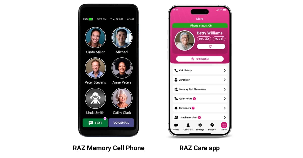 The RAZ Memory Cell Phone is designed for seniors with dementia, cognitive decline, or vision loss, and for the caregivers who support them. The phone uses a single main screen with contact photos for one-touch calling and an optional emergency button. Caregivers can manage contacts, settings, reminders, quiet hours, call limits, and status checks remotely through the RAZ Care app on their own smartphone.